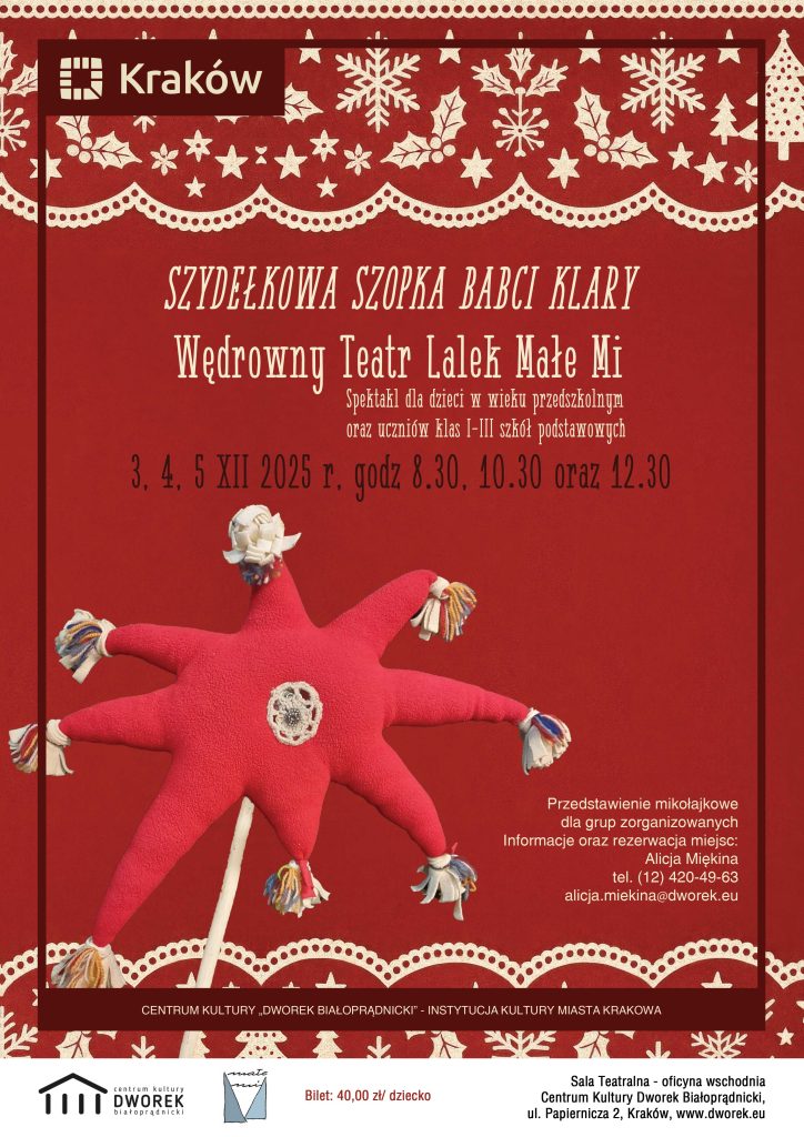 Przy pomocy Włóczki i Szydełka Babcia Klara wyczarowała wszystkie postaci znane z tradycyjnej szopki. Jest tu Dzieciątko, Maria, Józef, są Trzej Królowie, Pasterze, Zwierzęta i… duuużo Aniołów. Aktorzy Teatru Małe Mi ożywiają wszystkich bohaterów, opowiadając historię znaną od ponad 2 tysięcy lat. Jasełkowe przedstawienie z oryginalnymi lalkami, ze wspólnym śpiewaniem kolęd i pastorałek–wprowadza młodych widzów w niezwykły świat Wigilijnej Nocy.